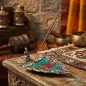 Transformez votre espace en sanctuaire de méditation avec ce porte-encens tibétain authentique en forme de feuille de Bouddha. Confectionné artisanalement en Inde selon les traditions ancestrales, ce support spirituel unique combine fonctionnalité et beauté esthétique. Ses couleurs vibrantes rouge, bleu profond et turquoise, sublimées par des détails métalliques, créent une atmosphère de sérénité parfaite pour vos rituels de méditation et votre décoration spirituelle.