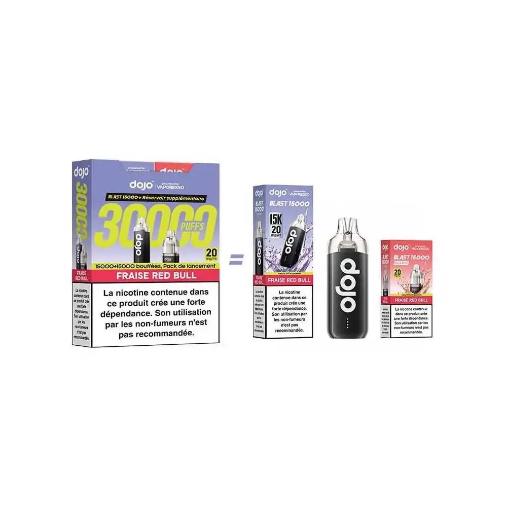 Le bundle inclut 1 kit Puff Dojo Blast 15K complet en 10ml saveur Fraise Red Bull 20mg et 1 pod supplémentaire Dojo Blast 15K en 10ml de la même saveur, soit un total de 30000 bouffées.