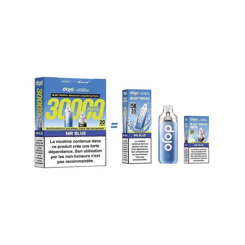 Le bundle contient 1 kit Puff Dojo Blast 15K complet en 10ml saveur Mr Blue 20mg et 1 pod supplémentaire Dojo Blast 15K en 10ml saveur Mr Blue 20mg, soit un total de 30000 bouffées.