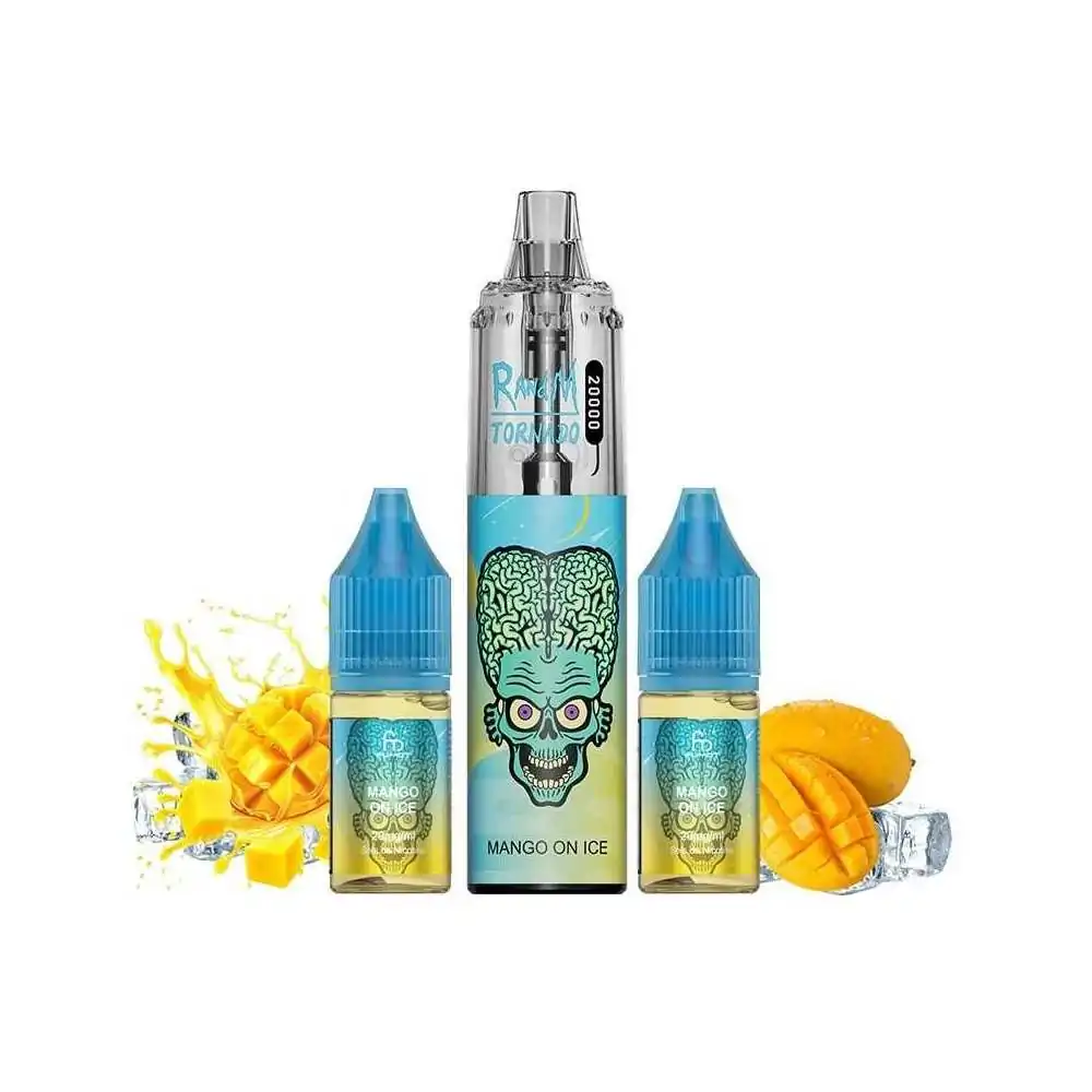 Le kit comprend 1 dispositif Puff Tornado RandM 850mAh avec réservoir vide et 2 flacons de 10ml de la saveur Mango on Ice en 20mg de sels de nicotine. Le câble USB-C n'est pas inclus.